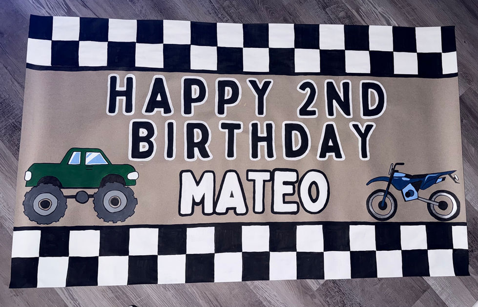 A collection of colorful banners and signs for birthday celebrations, featuring themes like trucks, camouflage, and cartoon characters of the clients choice.